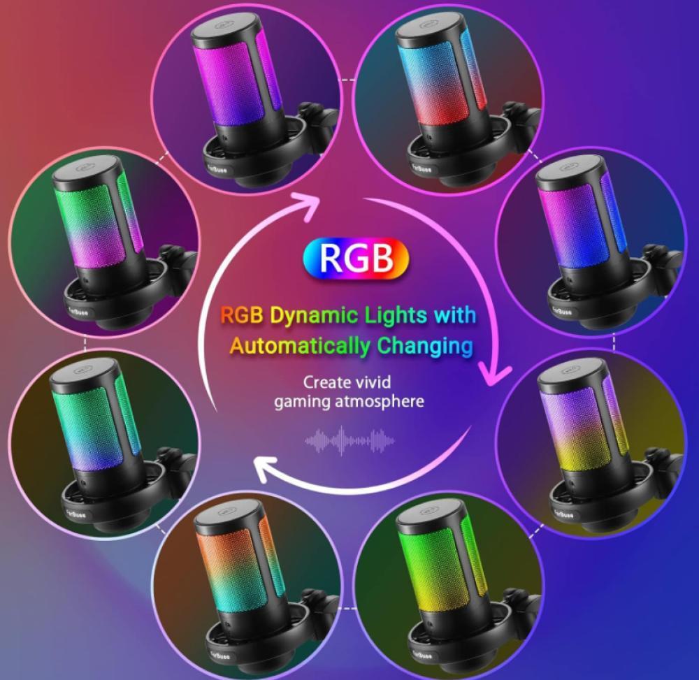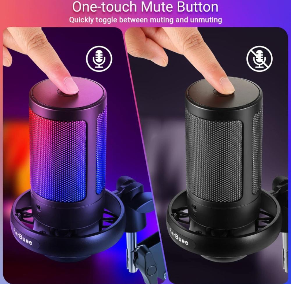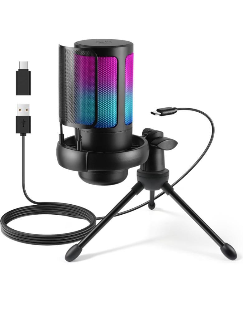 ميكروفون العاب USB للكمبيوتر مع اضاءة RGB وزر كتم الصوت والتحكم في مستوى الصوت ومقبس سماعة راس 3.5 ملم متوافق مع ويندوز وماك او اس والهواتف الذكية وبلاي ستيشن 4/5 من فيربوي (اسود - مع حامل ثلاثي